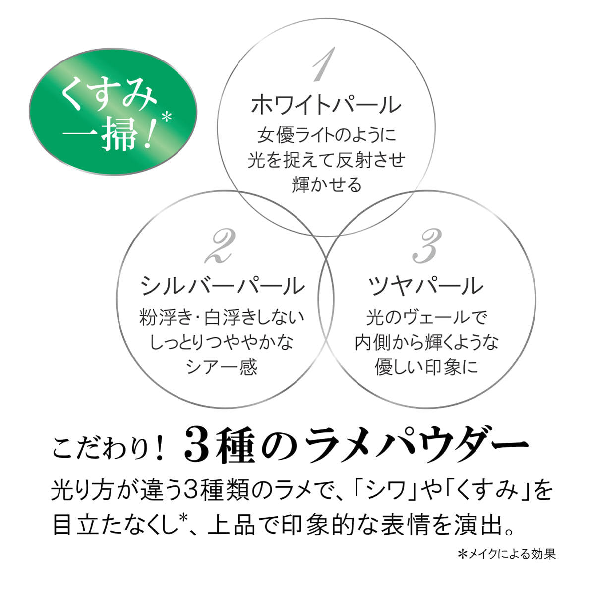 【3種のラメパウダー】 ■ホワイトパール 女優ライトのように光を捉えて反射させ肌を輝かせます。