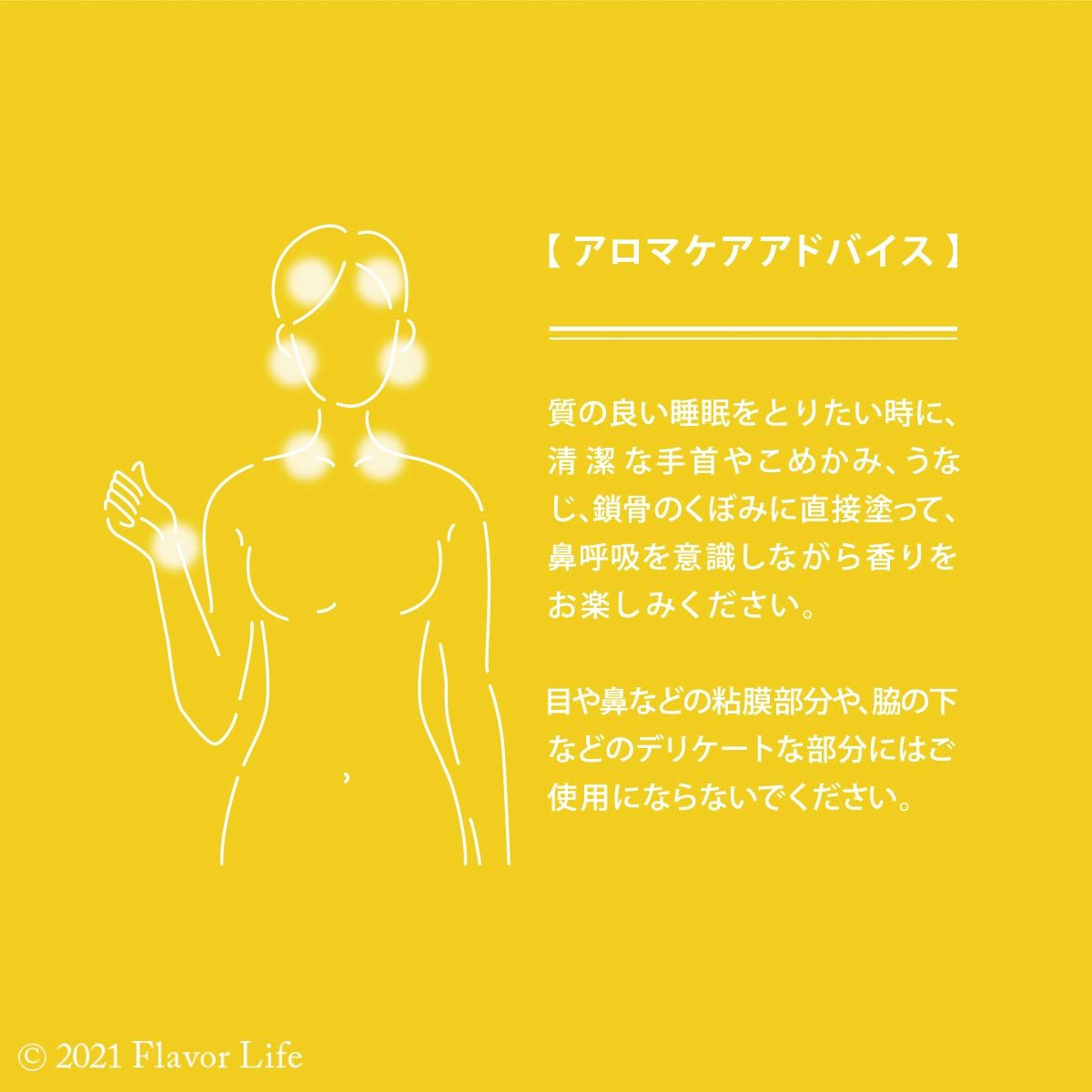 質の良い睡眠をとりたいときに、清潔な手首やこめかみ、うなじ、鎖骨のくぼみに直接塗って、鼻呼吸を意識しながら香りをお楽しみください。